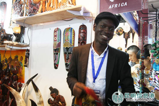 一阵急促而热烈的鼓点吸引了许多展客驻足在非洲展位前,而敲鼓的正是来自乌干达的Wilson。身着正装,头戴黑帽,热情开朗的他在展会上交到了许多好朋友。在向展客们表演非洲鼓的间隙,Wilson还不忘用中文向记者推荐昆明的过桥米线:“真的太好吃了!”只学了1个月的中文,Wilson已经能够和展客们进行简单的中文交流,当问到生意状况如何时,Wilson摊摊手说:“马马虎虎”,不太流利的腔调立即引起了围观展客们善意的大笑。记者廖拓溪/摄