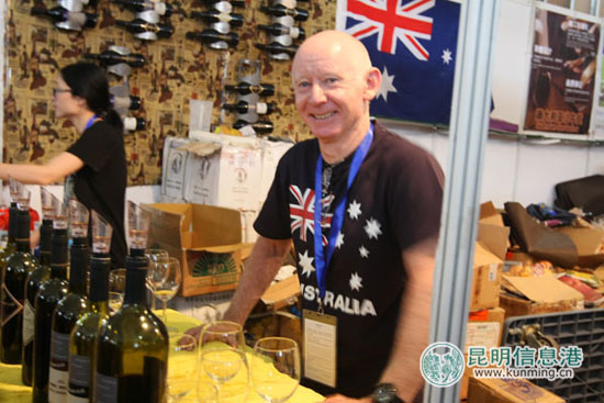 一名澳大利亚“老帅哥”笑容灿烂,热情推介他带来的澳大利亚原产葡萄酒。记者廖拓溪/摄