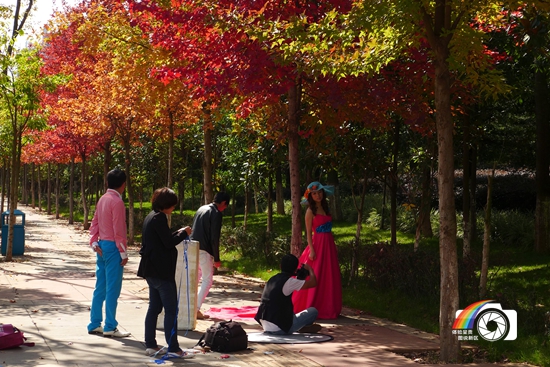 图片说明:万物竞春赛妖娆·生态呈贡!“枫”情万种。宜居呈贡秋意浓,枫叶似火映天红。红色的枫叶、金色的银杏叶、绿色的松叶,蓝天白云,“枫”情万种。在这样的季节,早已被这五颜六色的树叶组成了一副美丽画卷。摄于2013年10月31日彩云南路。