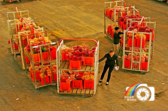 图片说明:繁忙的花卉交易中心员工!呈贡鲜花交易中心员工在交易拍卖前繁忙的分类准备鲜花品种。
