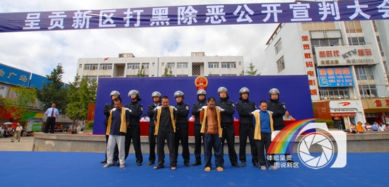 图片说明:打击犯罪,保护人民,维护公平正义是政法机关的职能所在。为净化社会空气,彰显正义,我区公、检、法、司能力配合,一举打掉多个曾经一时危害新区群众的黑恶团伙,图为其被推上审判台接受人民的审判。