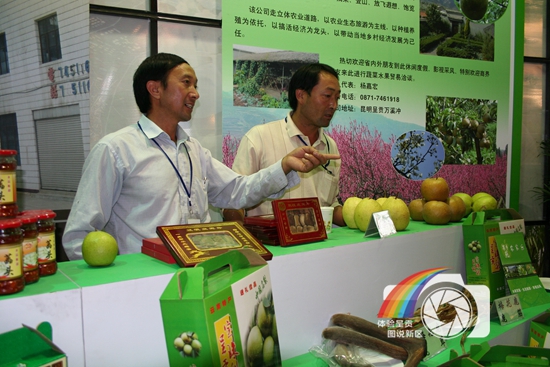 图片说明:呈贡名品宝珠梨亮相农业博览会上,让全国客商和参观者体味了一回百味纷呈品珍馐·舌尖呈贡隐。图为我区万溪冲致富带头人果香苑科技开发有限公司法人杨嘉宏在国际会展中心展台上热情兜售宝珠梨的场景。