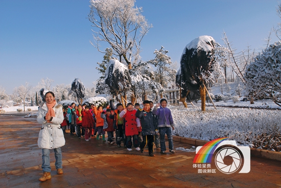 图片说明:为新区作贡献不能停留在嘴上,图上这位洛龙小学的女教师用爱心诠释这句话。此图就是其冒着严寒主动带学生感受新区建设成果为学生作文成为有源之水的最好铺垫。所以,她才是我区教育战线上的最美教师。