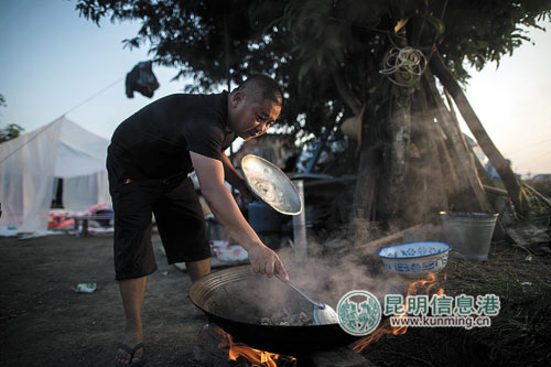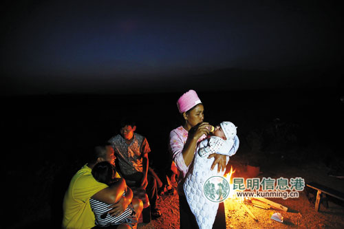 地震发生后,一户村民围着篝火取暖 记者张玉杰/摄