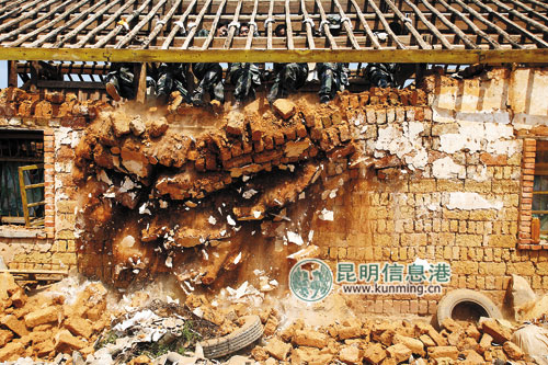 参加救援的战士拆除在地震中受损的房子 记者张玉杰/摄