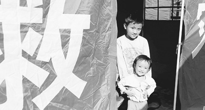 图为两名孩子在永平镇临时安置点的帐篷内玩耍。记者胡超/摄