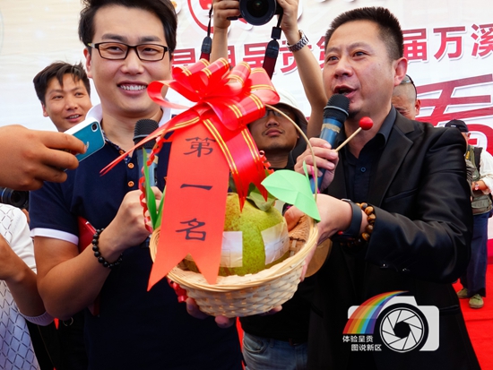 图片说明:2014年9月28日,随彩龙网友参加呈贡万溪冲宝珠梨采摘节闭幕式,见证了梨王的产生和拍卖的全过程。本图抓住了宣布梨王夺魁那激动人心的一刻,并且拍卖善款将捐献给云南鲁甸地震灾区,帮助那里的贫困学生。所以这梨王既是呈贡建设者勤劳能干的见证,更是他们民胞物与的爱心写照。