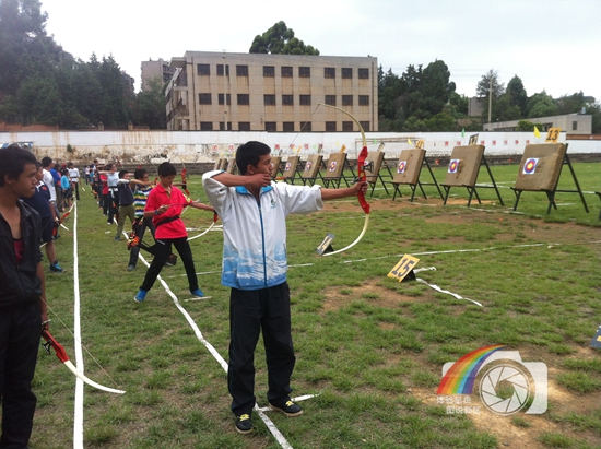图片说明:这是呈贡实验学校学生参加昆明市初中学生射箭比赛时的一个镜头。用力拉满了弦,瞄准目标射去!