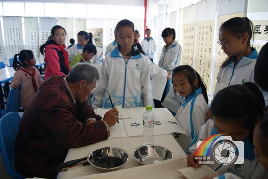 图片说明:这是呈贡老年大学的书法爱好者们到实验学校为学生写字的一个镜头。当我们学习繁重的时候,我们不妨重温一下书法的魅力,它可以让我们内心变得充实有力,让我们的心灵变得安静自然。