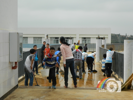 图片说明:这是呈贡实验学校学生打扫校园卫生时的一个镜头。小学生们在老师的指导下正用清水洗干净校园,让自己的学校变得更加美丽!