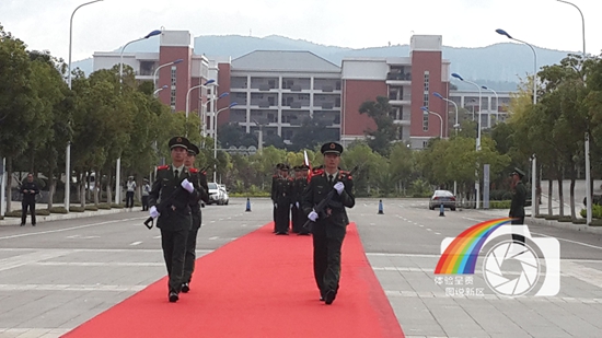 图片说明:2014年国庆升旗仪式上,仪仗队迈着矫健的步伐向升旗台走来。