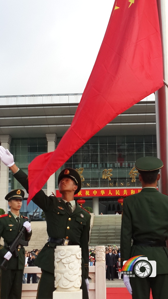 图片说明:2014年10月1日在昆明会堂广场举行庄严的升旗仪式,升旗手将五星红旗用力甩起来。