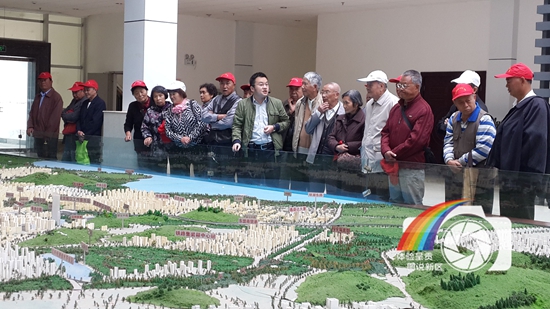 图片说明:呈贡建设总策划师!市民看家园 逛新城活动邀请曾经在呈贡工作过的老领导参观新区,呈贡规划总工程师向泽涛正在沙盘前为老领导讲解新区规划情况。
