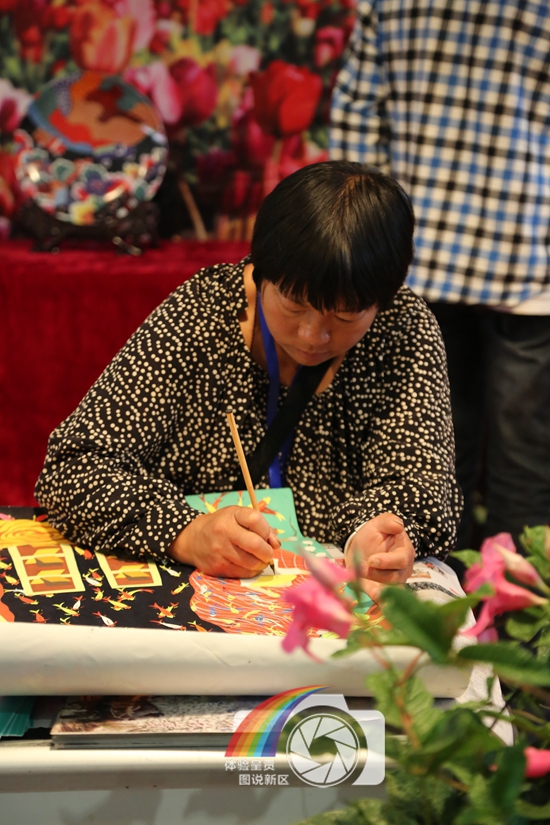 图片说明:农民画民间画家在文化博会上用彩笔绘制呈贡的美好生活。