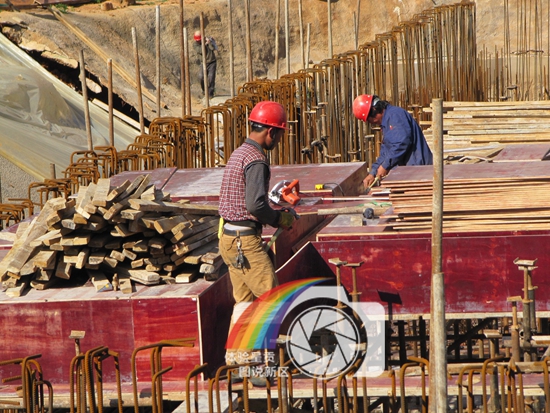 图片说明:工人们在烈日下一砖一瓦搭建最坚实的建筑。