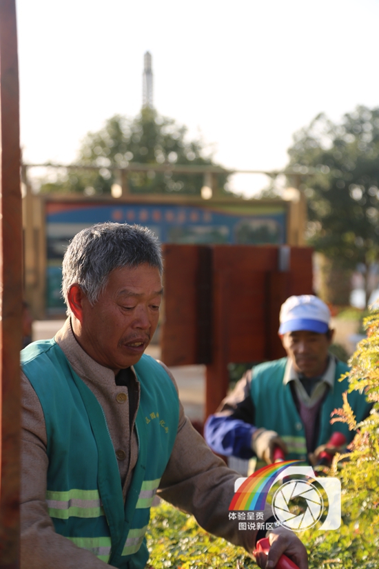 图片说明:新区,就在黑发变白发的岁月里成长,就在绿化工人翻飞的修剪下,定格成一个永不褪色的春天。