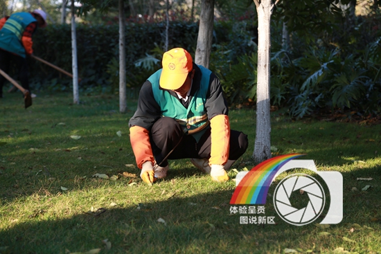 图片说明:绿化工人毫不犹豫掏出随身携带的钥匙,仔细清理附着在草地上的顽固小物障。