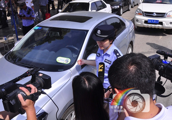 图片说明:呈贡公安分局全省首发“车名片”便民利民新警务,创新解决挪车难的问题。图为各家新闻媒体正在采访报道关于呈贡首家创新发放“车名片”的举措,民警正在向记者作详细介绍。