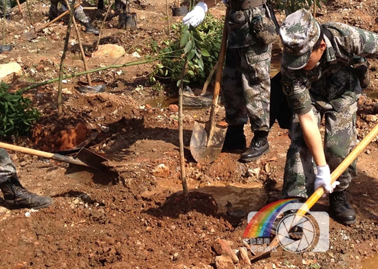 图片说明::驻呈部队官兵正在卖力地铲土植树。