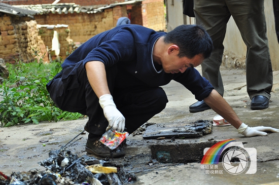 图片说明:民警在阴沟搜寻嫌疑人作案工具。