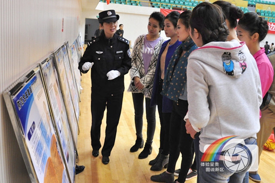 图片说明:图为女警向高校师生宣讲法律法规常识及相关应急避险措施。