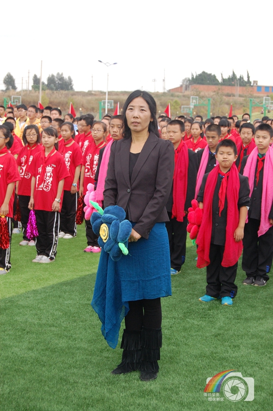 图片说明:云大附中呈贡校区初一三班班主任李凡老师和学生们在运动会开幕式上。