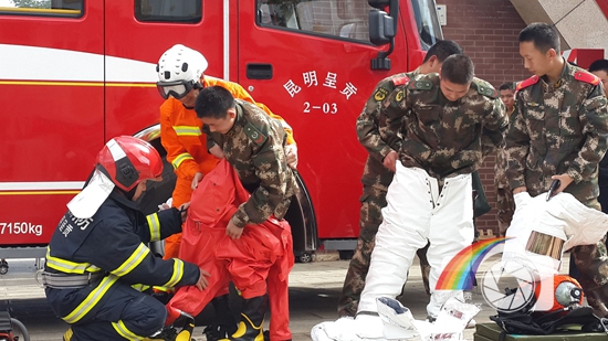 图片说明:呈贡区消防大队洛龙中队的官兵穿上防护服。