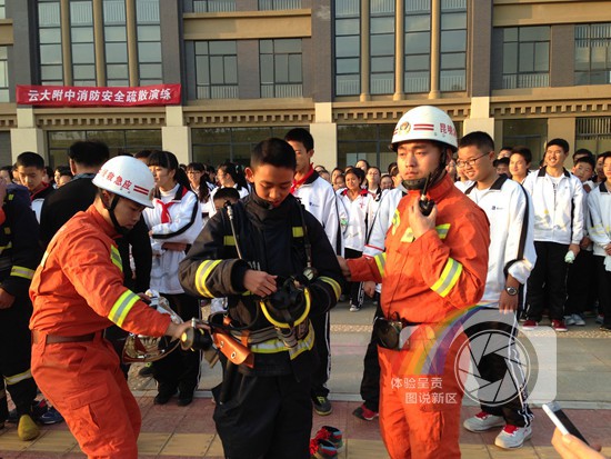 图片说明:2014年11月18日,呈贡区消防演习在云大附中呈贡校区(呈贡新区中学)举行,学生体验穿消防战斗服。