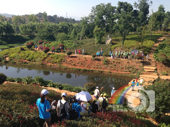 图片说明:2014年5月17日,由30名市民组成的“逛新城”代表团走在呈贡捞鱼河岸边,河水清澈,人群倒影清晰可见。