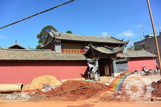 图片说明:工人正在维修位于万溪冲的回龙寺。