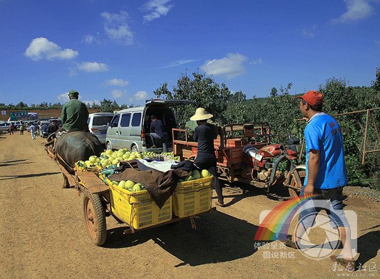 图片说明:2014年的万溪宝珠梨采摘节规模比以往大了许多,梨农用牛车载梨。