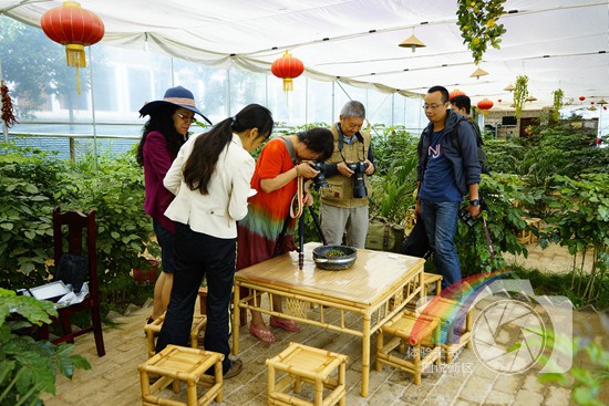图片说明:一群网友正对着印象农家的菜品拍照。