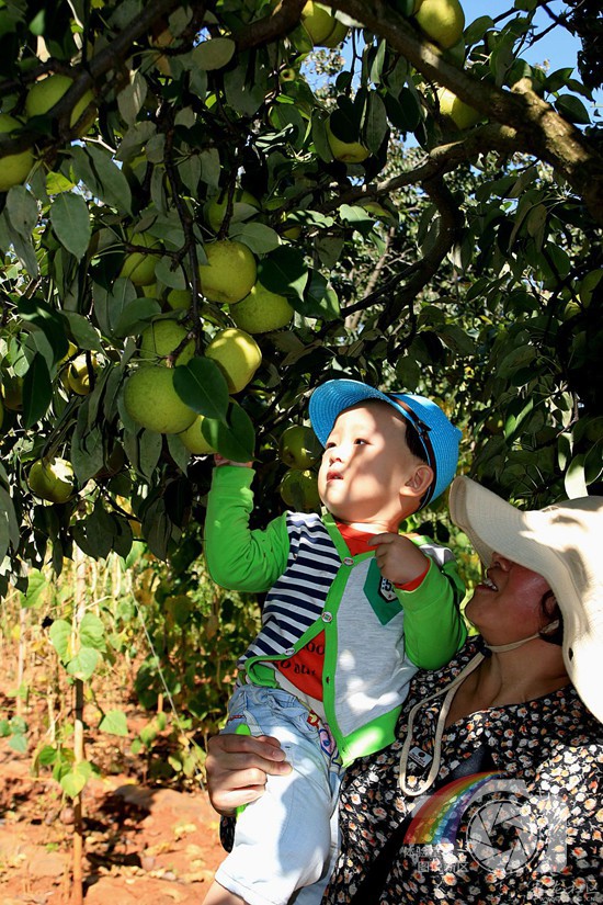 图片说明:宝珠梨熟了,小孩在大人帮助下摘梨。
