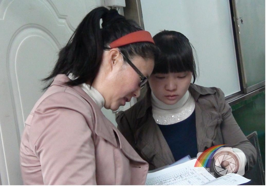 图片说明:图为龙街小学晋晓花老师正与同事交流教学工作。