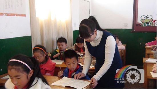 图片说明:图为龙街小学段燕老师正在客堂上检查和辅导学生作业。