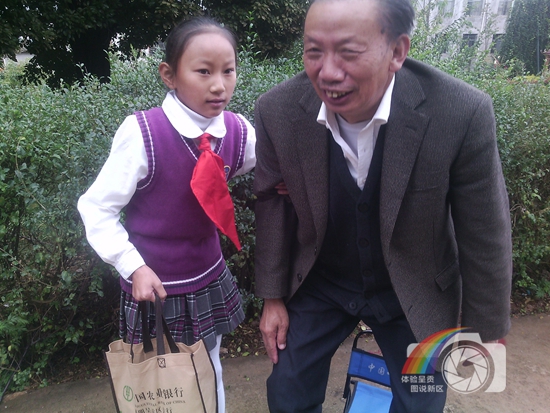 图片说明:图为龙街小学李博佳同学搀扶老人走路。