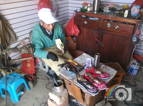 图片说明:李荣贵,男,肢体残疾二级,乌龙街道乌龙社区村民,因小儿麻痹症导致身体残疾。但身残志坚的他,以帮别人补鞋、纳底等贴补家用。随着呈贡新区建设的不断发展,村民生活水平日渐提升,修鞋摊生意每况愈下。通过仔细观察,李荣贵发现村民爱穿绣花鞋,以前全是用千层布纳的鞋底,现在很多人喜欢用橡胶底,于是他又做上了帮人纳绣花鞋底的生意。他说“我虽然是残疾人但我不能成为政府和别人的负担,我尽我自己的所能也能生活得很精彩。”