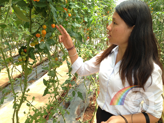 图片说明:来自晨农生态农庄的讲解员为游客讲解晨农培植的绿色瓜果。