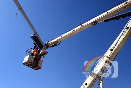 图片说明:摄于呈贡景明北路师范大学路边。图为交通设施维护工人正在高空维修交通信号灯。