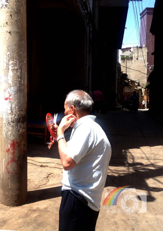 图片说明:拍摄于呈贡老街。图为一个当地居住的老人正在阳光下修面,这份从容的气定神闲,让人觉得那些流逝的岁月,不过就是轻轻剪断的细细碎碎的胡茬。