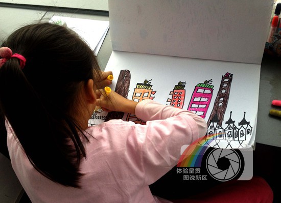 图片说明:摄于驻呈企业上海东盟大厦内。图为龙街小学的孩子,正用彩笔挥就自己心目中的呈贡新城。