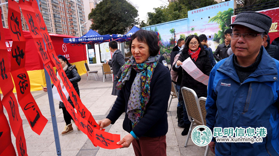 昆明信息港讯 通讯员李伟 王颖 春节,贴春联、窗花是一项古老的民俗。官渡区新亚洲体育城社区居民在自家门口就可以领到邻里间的书法爱好者、手工爱好者书写的春联和剪出的窗花。
