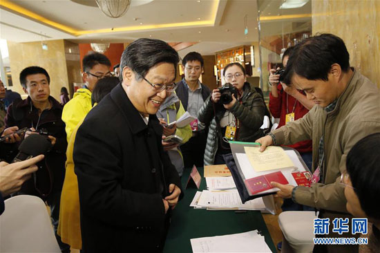 3月2日,全国政协委员王海波(前左)在驻地报到。全国政协十二届四次会议开幕在即,全国政协委员陆续抵达驻地报到。 新华社 记者沈伯韩/摄