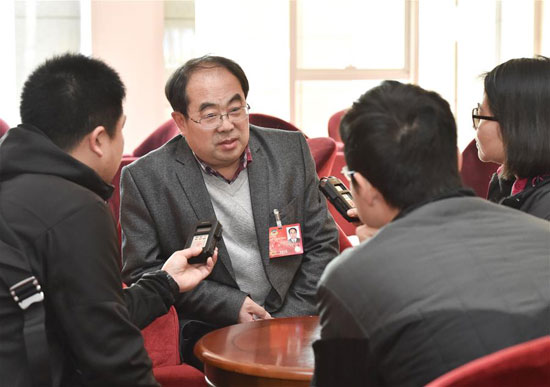 3月2日,全国政协委员刘平均(中)在驻地接受采访。全国政协十二届四次会议开幕在即,全国政协委员陆续抵达驻地报到。 新华社 记者沈伯韩/摄