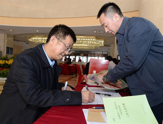 3月2日,全国政协委员曹洪欣(左)在驻地报到。全国政协十二届四次会议开幕在即,全国政协委员陆续抵达驻地报到。 新华社 记者李贺/摄