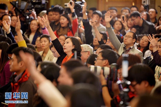 3月2日,全国政协十二届四次会议新闻发布会在北京人民大会堂举行,大会新闻发言人王国庆介绍会议有关情况并回答中外记者提问。这是记者在发布会上举手提问。新华社 记者李鑫/摄