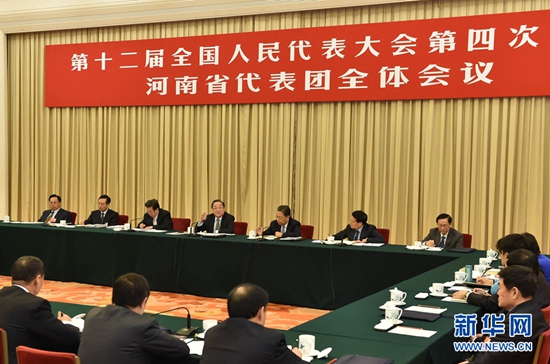 3月8日,中共中央政治局常委、全国政协主席俞正声参加十二届全国人大四次会议河南代表团的审议。 新华社 记者高洁/摄