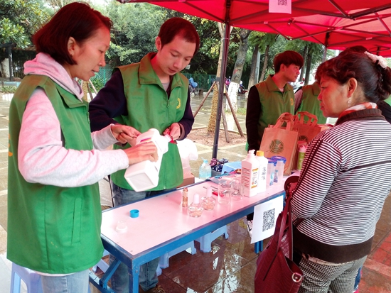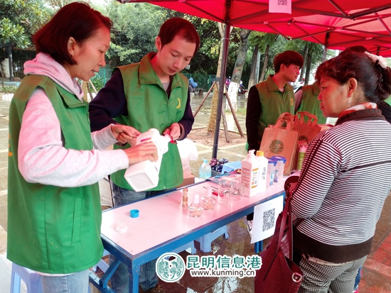 现场点上,工作人员当场做实验,为市民们讲解了荧光剂的危害以及环保酵素对于净化水质的优越性。
