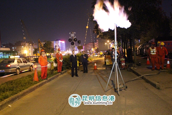 在置换期间,官渡区天然气置换工作指挥部积极做好协调和应急保障工作,官渡区安监、消防、城管、金马街道等前期对置换区域各放散点、老旧小区进行了现场踏勘,明确了重点保障区域及置换服务点。14日晚上8:00置换正式开始,共设置73个低压放散点,2个中压放散点。官渡区指挥部各成员单位现场检查巡查,及时消除隐患、协调处理相关问题,确保置换工作安全有序开展。在一处中压放散点,原预定放散位置附近有车辆停放,存在安全隐患,官渡区指挥部及时与负责实施燃烧放散的燃气公司勾通后现场调整了放散位置,确保了安全放散。