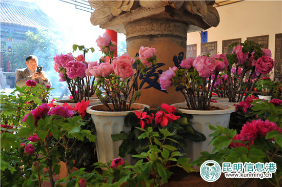 来到昙华寺门口,新修复揭幕的“昙华寺”3个金色大字匾联悬挂在此,令公园增色不少。步入园内“名花春荟 昙华天香”的牡丹园林造景周边,一簇簇或白、或粉、或红艳的牡丹异常艳丽,锦绣雍容。一路循着花香前行,遍地地栽牡丹在公园通幽曲径和花间树下含苞待放,来到主景区,精心布置的近2000盆催花牡丹一簇簇恣意开放,忍不住让人驻足观赏。